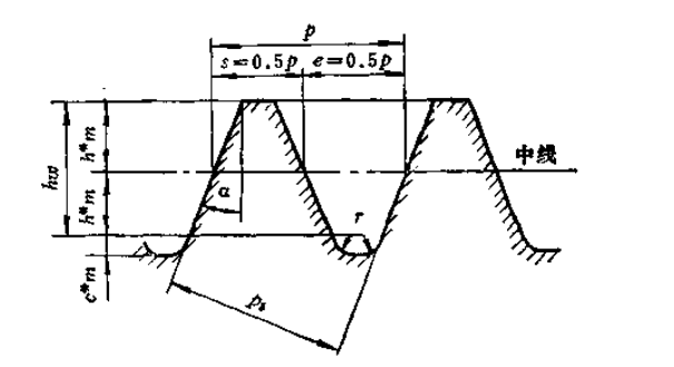 標(biāo)推齒輪齒條的齒廓又稱為齒輪的基準(zhǔn)齒廓。這是因?yàn)辇X輪齒條的齒廓為直線,對(duì)計(jì)算和測(cè)量都較方便,因此定齒輪標(biāo)準(zhǔn)時(shí),就用標(biāo)雅齒輪齒條的齒廓為標(biāo)準(zhǔn)。GB1356-78和GB1357-78中規(guī)定了標(biāo)淮齒輪齒條的基本參教(見圖1-18):模數(shù)m有一系列的標(biāo)排值,見表1-1;a=20°:h*=1或0.8;c*=0.25或0.3;r=0.38m或0,46m;hu=m或0.8m3工作齒高h(yuǎn)=2m或1.6m。