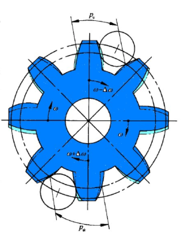 這時盡管蝸桿勻速旋轉,蝸桿與蝸輪嚙合節(jié)點的線速度相同,但由于蝸輪上的半徑不斷改變,從而使蝸輪和齒坯產生不均勻回轉,角速度在(ω+△ω)和(ω-△ω)之間,以一轉為周期變化。