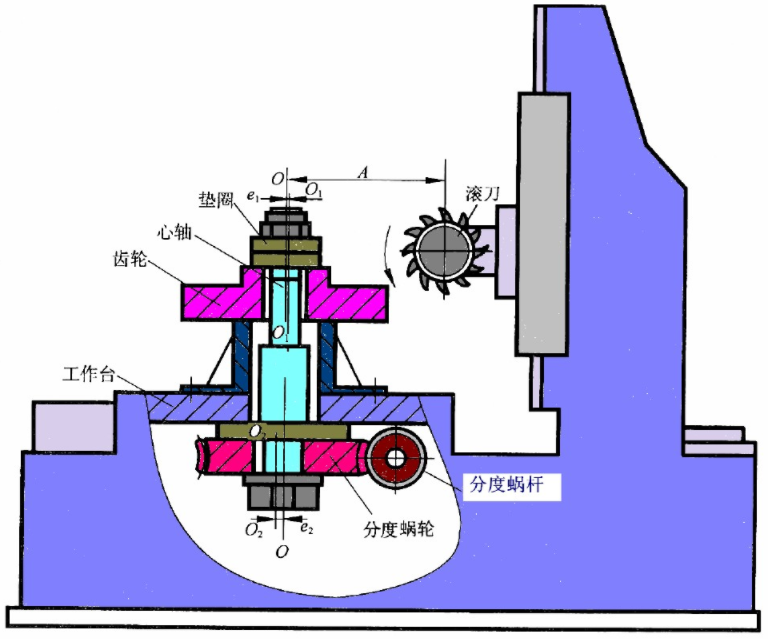 機床分度蝸輪的軸線O2O2,它與機床心軸的軸線OO不重合,形成運動偏心(e2)。