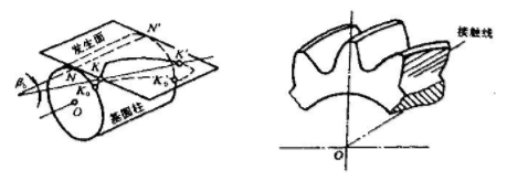 不難看出,齒輪齒廓曲面與基圓柱軸線垂直的平面(齒輪瑞面)上的交線(端面上的齒廓曲線)仍是漸開線。且因這類漸開線有一模一樣的基圓柱,因此它們的形狀均是相同的,只不過是展成的起始同面己,即起始點分別處于螺旋線KK′上的各點。因此其齒面為漸開螺旋面。