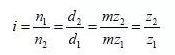 將直徑尺寸不同的齒輪組合進行嚙合,能夠改變傳遞的旋轉(zhuǎn)速度。設傳遞運動的主動齒輪與被傳遞運動的被動齒輪的旋轉(zhuǎn)速度分別為n1和n2、齒數(shù)分別為z1和z2、分度圓直徑分別為d1和d2,使用模數(shù)就能推導出下式所示的傳遞速度比i的計算式。