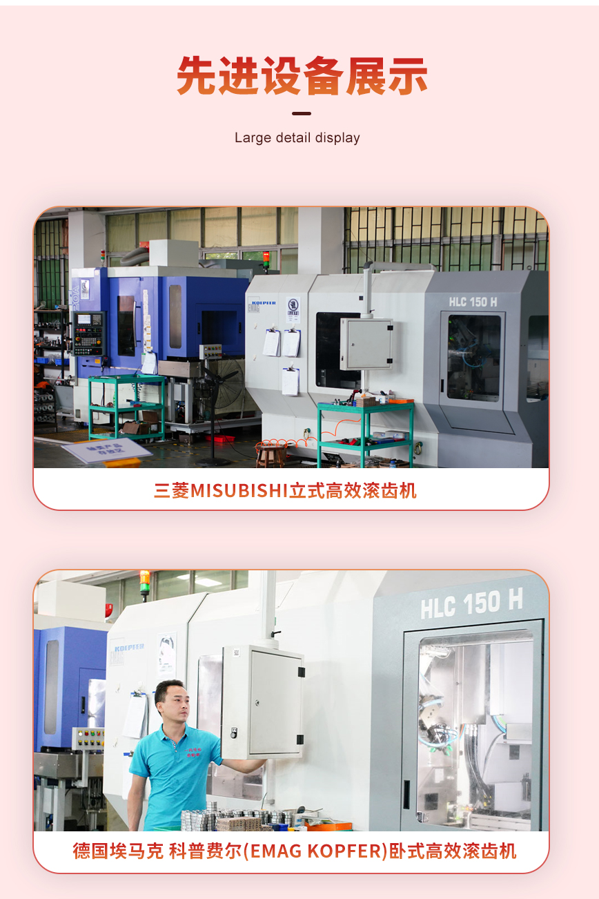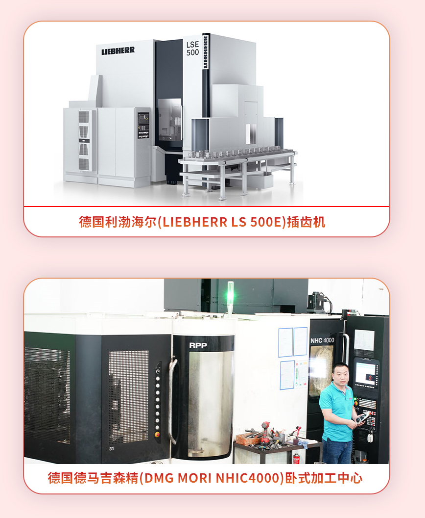 配備車齒、滾齒、剃齒、研齒、插齒、磨齒等齒輪加工工藝,使用進(jìn)口數(shù)控機械設(shè)備:日本龍澤車床、三菱滾齒機(帶自動上下料)、德國埃馬克科普費爾滾齒機(帶自動上下料)、德國利勃海爾數(shù)控插齒機、德國德馬吉DMG臥式加工中心(帶5個工作臺) 等。